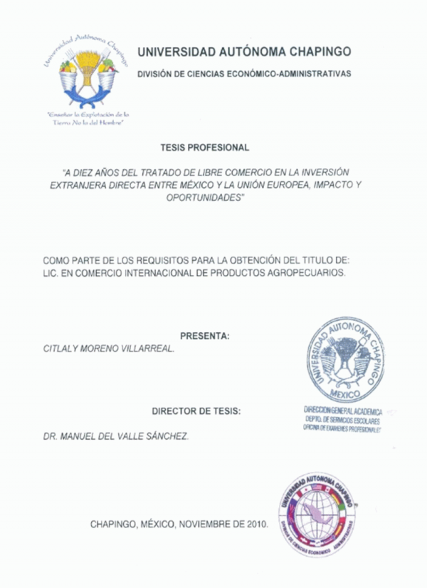 A diez años del tratado de libre comercio en la inversión extranjera directa entre México y la Unión Europea, Impacto y oportunidadesT /por Citlaly Moreno Villarreal; director Manuel del Valle Sánchez