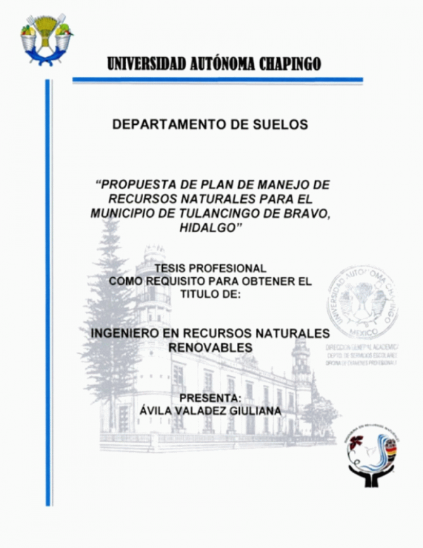 Propuesta de plan de manejo de recursos naturales para el municipio de Tulancingo de Bravo, Hidalgo /por Giuliana Ávila Valadez; director de tesis Alejandro Ismael Monterroso Rivas.