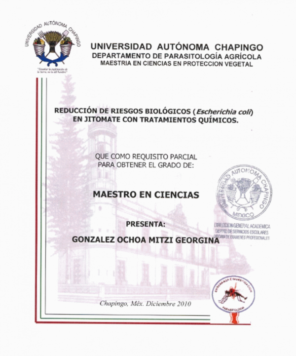 Reducción de riesgos biológicos (Escherichia coli) en jitomate con tratamientos quimícos [En línea] / /por Mitzi Georgina González Ochoa; director de tesis Marcelo Acosta Ramos.