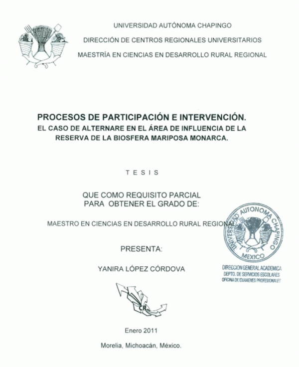 Proceso de participación e intervención el caso de alternare en el área de influencia de la Reserva de la Biosfera Mariposa Monarca /por Yanira López Córdova; director de tesis David Oseguera Parra.