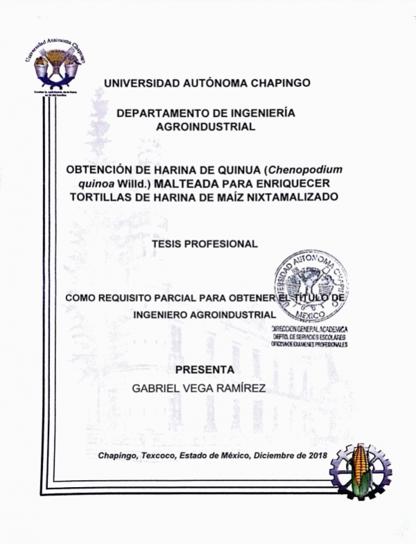 Obtención de harina de quinua (Chenopodium quinoa Willd.) malteada para enriquecer tortillas de harina de maíz nixtamalizado / Gabriel Vega Ramírez.