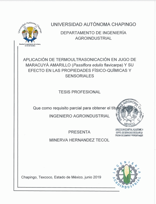 Aplicación de termoultrasonicación en jugo de maracuyá amarillo (Passiflora edulis flavicarpa) y su efecto en las propiedades físico-químicas y sensoriales / Minerva Hernández Tecol