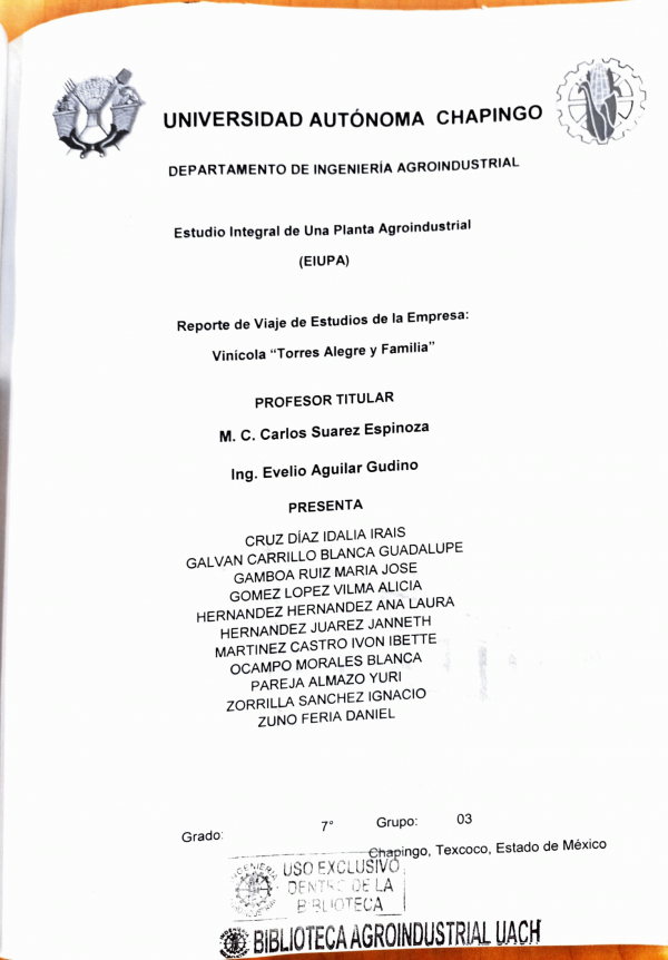 Reporte de viaje de estudios de la empresa Vinícola Torres Alegre y Familia / coordinadores Carlos Suárez Espinosa y Evelio Aguilar Gudino ; colaboradores Idalia Irais Cruz Díaz...[y otros]