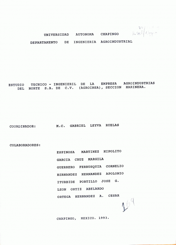 Estudio técnico-ingenieril de la empresa Agroindustrias del Norte S. A. de C. V. de (AGROINSA), sección harinera / coordinador Gabriel Leyva Ruelas ; colaboradores Hipólito Espinosa Martínez...[et al.]