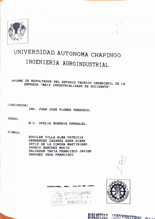 Informe de resultados del estudio técnico-ingenieril de la empresa Maíz Industrializado de Occidente / coordinador Juan José Flores Verduzco y Ofelia Buendía González ; colaborador Alma Patricia Aguilar Villa...[et al.]