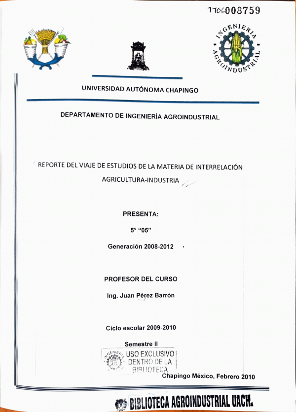 Reporte del viaje de la materia de interrelación Agricultura-Industria / coordinadores Juan Pérez Barrón ; colaboradores Guadalupe Stefanny Aguilar Moreno...[y otros]