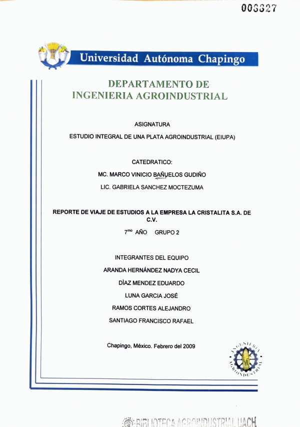 Reporte de viaje de estudios a la empresa La Cristalita, S. A. de C. V. / coordinadores Marco Vinicio Bañuelos Gudiño y Gabriela Sánchez Moctezuma ; colaboradores Nadya Cecil Aranda Hernández...[et al.]