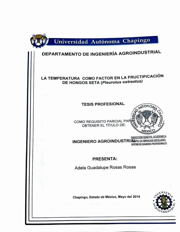 La temperatura como factor en la fructificación de hongos seta (Pleurotus ostreatus) / Adela Guadalupe Rosas Rosas