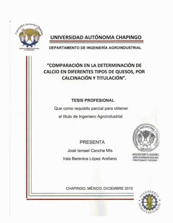 Comparación en la determinación de calcio en diferentes tipos de queso, por calcinación y titulación / José Ismael Canche Mis e Irais Berenice López Arellano
