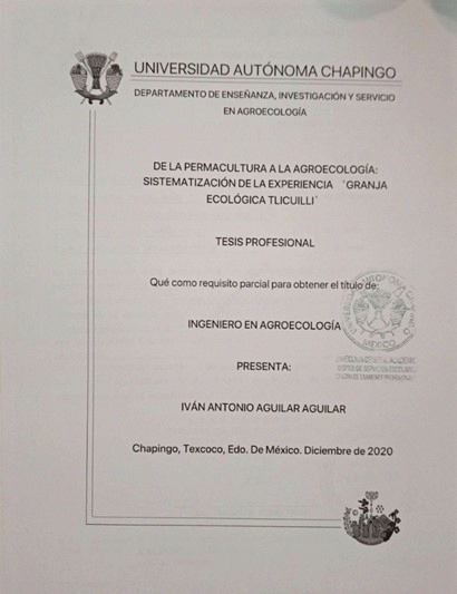 De la permacultura a la agroecología : sistematización de la experiencia "Granja Ecológica Tlicuilli"/ por Iván Antonio Aguilar Aguilar; director de tesis Laura Gómez Tovar.