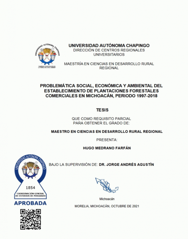 Problemática social, económica y ambiental del establecimiento de plantaciones forestales comerciales en Michoacán, periodo 1998-2017 / por Hugo Medrano Farfán; director de tesis Jorge Andrés Agustin