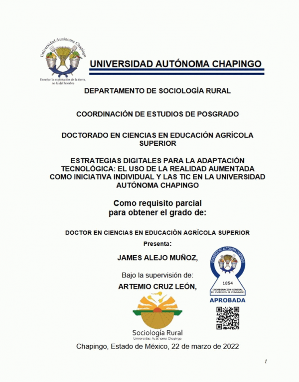 Estrategias digitales para la adaptación tenológica: el uso de la realidad aumentada como iniciativas individual de las TIC en la Universidad Autónoma Chapingo / por James Alejo Muñoz; director de tesis Artemio Cruz León