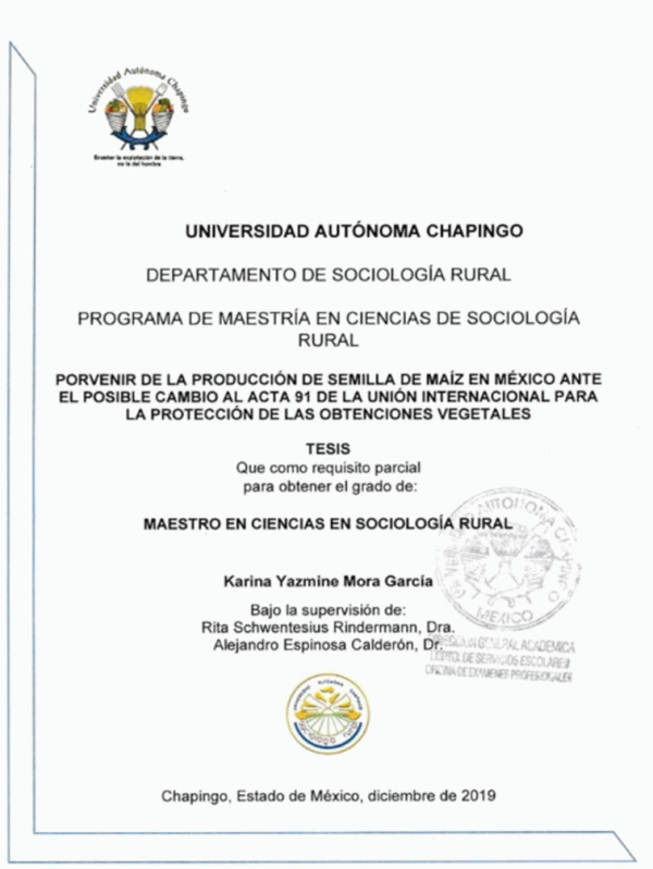 Porvenir de la producción de semilla de maíz en México ante el posible cambio al acta 91 de la Unión Internacional para la Protección de las Obtenciones Vegetales / Por Karina Yasmine Mora García; director de tesis Rita Schwentesius Rindermann.