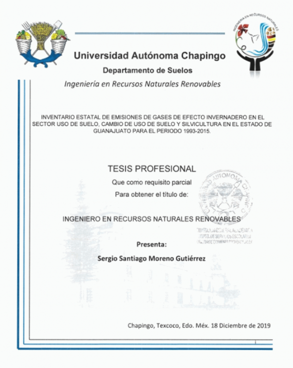 Inventario estatal de emisiones de gases de efecto invernadero en el sector uso de suelo y silvicultura en el Estado de Guanajuato para el periodo 1993-2015 / por Sergio Santiago Moreno Gutiérrez; director de tesis César Moreno García.