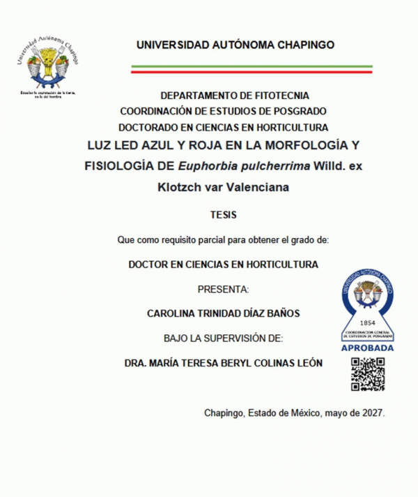 Luz led azul y roja en la morfología y fisiología de Euphorbia pulcherrima Willd. ex Klotzch var Valenciana / por Carolina Trinidad Díaz Baños ; director de tesis María Teresa Beryl Colinas León.