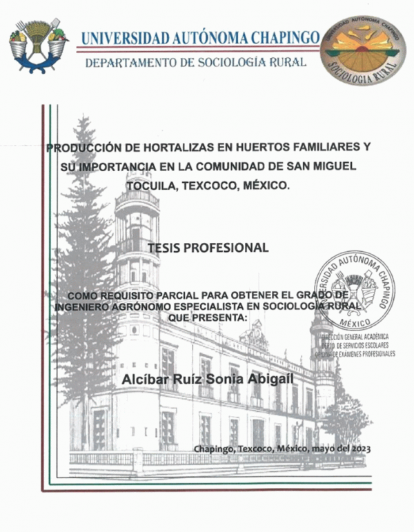 Producción de hortalizas en huertos familiares y su importancia en la comunidad de San Miguel Tocuila, Texcoco, México / por Sonia Abigail Alcibar Ruíz ; director de tesis Gaudencio Sedano Castro.