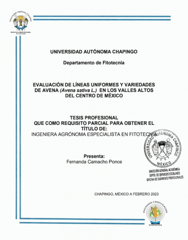 Evaluación de lineas uniformes y variedades de avena (Avena sativa L.) en Los Valles Altos del Centro de México / por Fernanda Camacho Ponce ; director de tesis René Hortelano Santa Rosa.