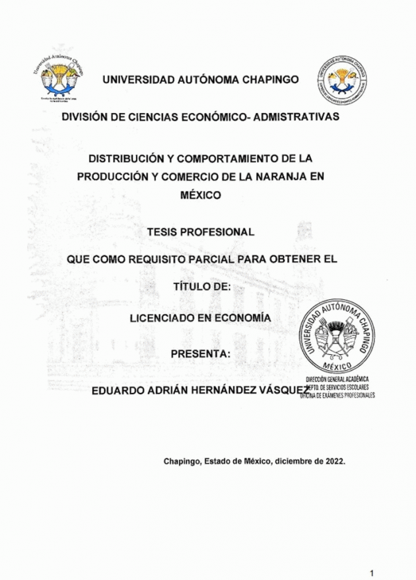 Distribución y comportamiento de la producción y comercio de la naranja en México / por Eduardo Adrián Hernández Vásquez ; director de tesis Ignacio Caamal Cauich.