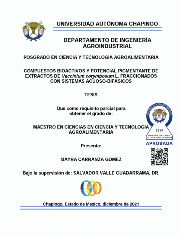 Compuestos bioactivos y potencial pigmentante de extractos de Vaccinium corymbosum L. fraccionados con sistemas acuoso-bifásicos / Mayra Carranza Gómez