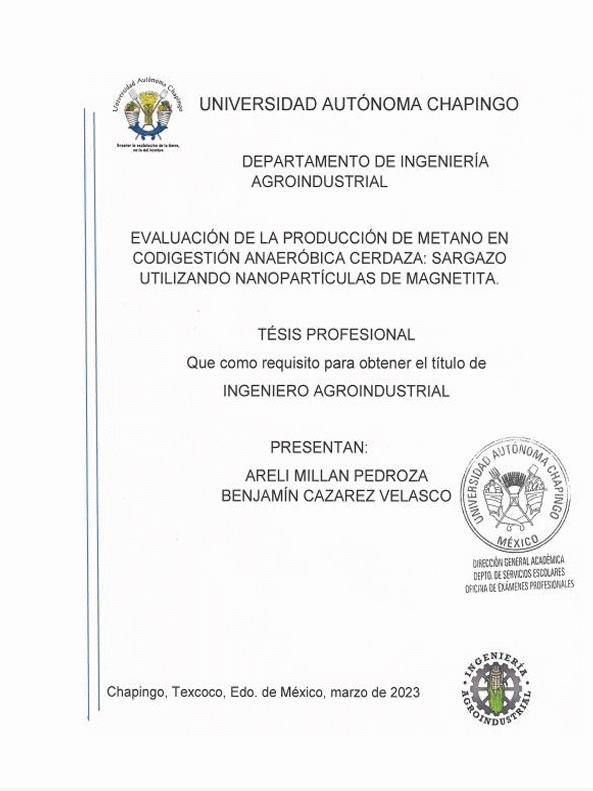 Evaluación de la producción de metano en codigestión anaeróbica cerdaza : sargazo utilizando nanopartículas de magnetita / Benjamín Cazarez Velasco y Areli Millan Pedroza