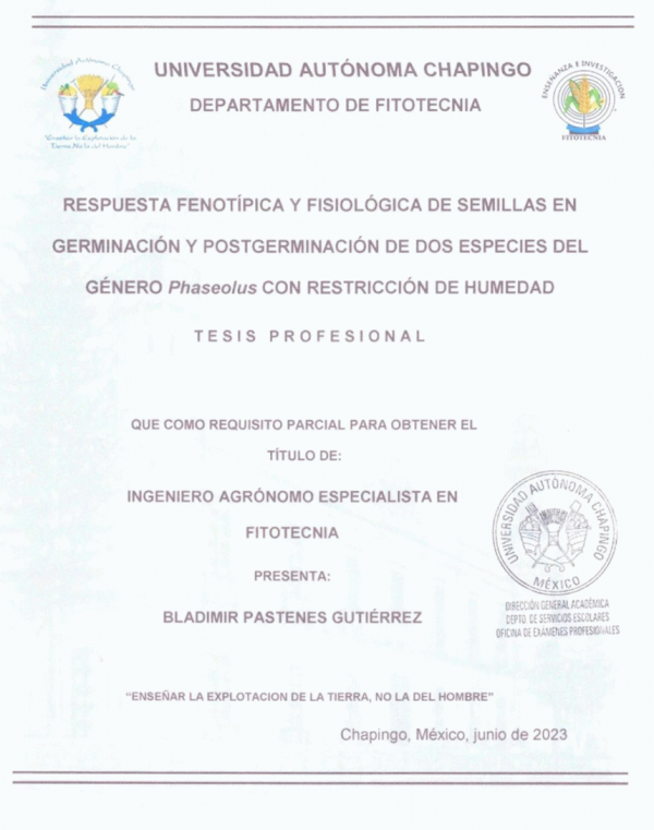 Respuesta fenotípica y fisiológica de semillas en germinación y postgerminación de dos especies de género Phaseolus con restricción de humedad / por Bladimir Pastenes Gutiérrez ; director de tesis Daniel Padilla Chacón.
