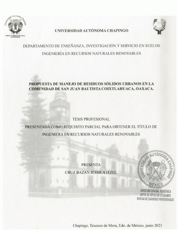 Propuesta de manejo de residuos sólidos urbanos en la Comunidad de San Juan Bautista Coixtlahuaca, Oaxaca / por Jessica Itzael Cruz Bazán ; director de tesis Elizabeth Hernández Acosta.