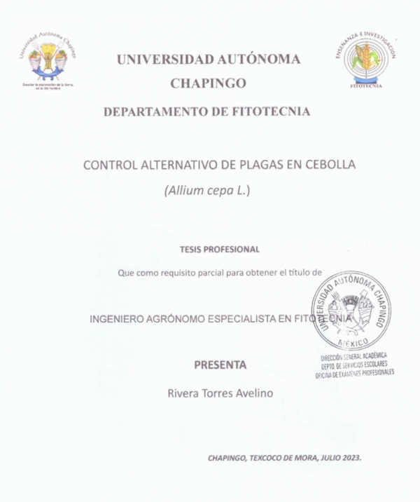 Control alternativo de plagas en cebolla (Allium cepa L.) / por Avelino Rivera Torres ; director de tesis Raúl Jacinto Mata.