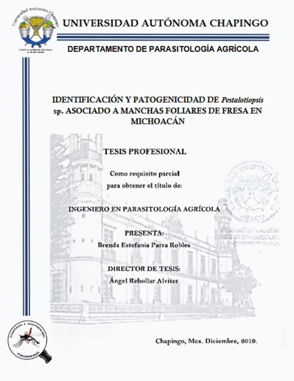 Identificación y patogenecidad de Pestalotiopsis sp. asociado a manchas foliares de fresa en Michoacán / por Brenda Estefania Parra Robles : director de tesis Ángel Rebollar Alviter.