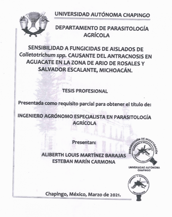 Sensibilidad a fungicidas de aislados de Colletotrichum spp. causante del antracnosis en aguacate en la Zona de Ario de Rosales y Salvador Escalante, Michoacán / por Aliberth Louis Martínez Barajas y Esteban Marín Carmona ; director de tesis Bertha Tlapal Bolaños.