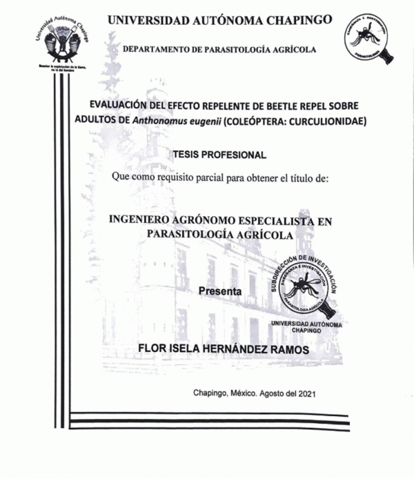 Evaluación del efecto repelente de Beetle repel sobre adultos de Anthonomus eugenii (Coleóptera : curculionidae) / por Flor Isela Hernández Ramos ; director de tesis Manuel Alejandro Tejeda Reyes.