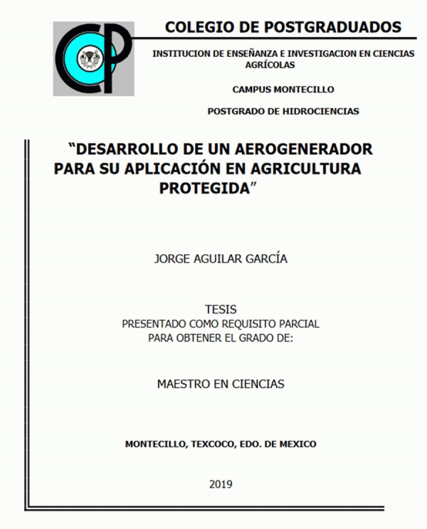 Desarrollo de un aerogenerador para su aplicación en agricultura protegida / por Jorge Aguilar García; director Oscar Luis Palacios Vélez