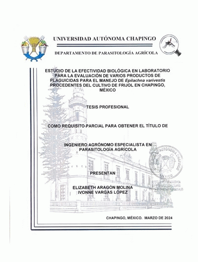 Estudio de la efectividad biológica en laboratorio para la evaluacón de varios productos de plaguicidas para el manejo de Epilachna varivestis procedentes del cultivo de frijol en Chapingo, México / por Elizabeth Aragón Molina y Ivonne Vargas López ; director de tesis Jaime Alfredo Urzúa Gutiérrez.