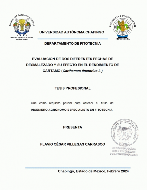 Evaluación de dos diferentes fechas de desmalezado y su efecto en el rendimiento de cártamo (Carthamus tinctorius L.) / por Flavio César Villegas Carrasco; dirección Samuel Sánchez Domínguez; secretario José de Jesús Loyola; vocal Arturo Chong Eslava; suplente Raúl Ayanegui Méndez; suplente Carlos Sánchez Abarca
