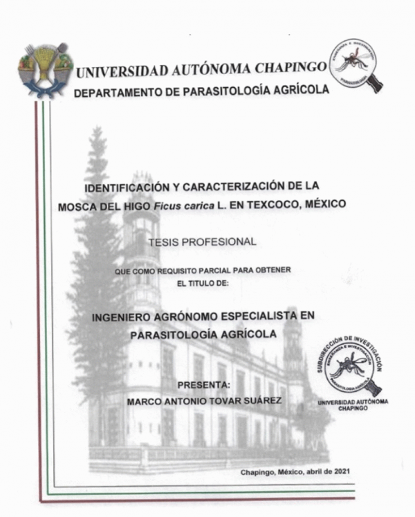 Identificación y caracterización de la mosca de higo Ficus carica L. en Texcoco, México / por Marco Antonio Tovar Suárez: director de tesis Oscar Morales Galván; secretario Néstor Bautista Martínez; vocal Ricardo Meráz Álvarez; suplente Andrés Bolaños Espinoza; Robero Abraham Ocampo Ruiz.