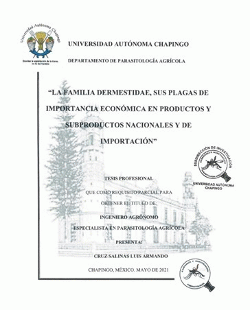 La familia Dermestidae, sus plagas de importancia económica en productos y subproductos nacionales y de importación / por Luis Armando Cruz Salinas; presidente Ma. del Carmen Sánchez Gálvez; secretario Dulce Azucena Hernández Zetina; vocal Hugo Enrique González García; suplente Dimas Mejía Sánchez; suplente Calixto Leopoldo Carrillo Fonseca