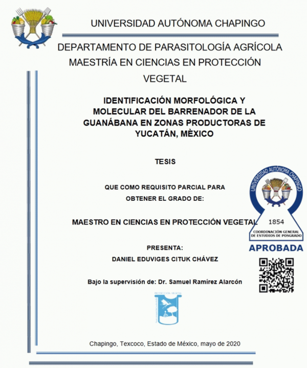 Identificación morfológica y molecular del barrenador de la guanabana en zonas productoras de Yucatán, México / por Daniel Eduviges Cituk Chávez; director Samuel Ramírez Alarcón; asesor Dimas Mejía Sánchez; asesor Manuel Alejandro Tejeda Reyes; asesor Erika Janet Zamora Macorra