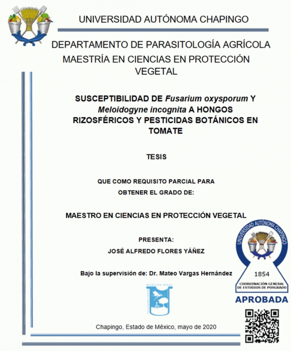Susceptibilidad de Fusarium oxysporum y meloidogyne incognita a hongos rizosféricos y pesticidas botanicos en tomate / por José Alfredo Flores Yañez; director Mateo Vargas Hernández; codirector Sergio Aynar Serna; asesor Marcelo Acosta Ramos