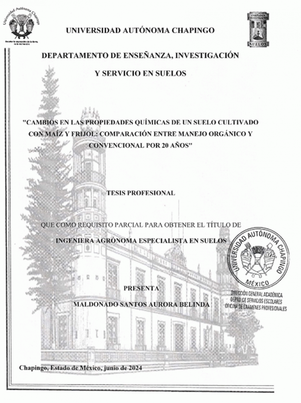 Cambios en las propiedades químicas de un suelo cultivado con maíz y frijol : comparación entre manejo orgánico y convencional por 20 años / por Aurora Belinda Maldonado Santos; director de tesis David Cristobal Acevedo; secretario Jorge Víctor Prado Hernández; vocal Raúl Zapata Rosales; suplente Francisco Razo López; suplente Edmundo Robledo Santoyo.