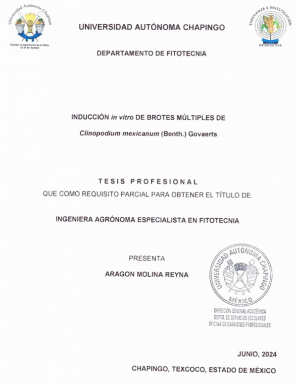 Inducción in vitro de brotes múltiples de clinopodium mexicanium (Benth.) Govaerts / por Reyna Aragón Molina; director de tesis Jorge Alberto Gutiérrez Gallegos; secretario José Luis Rodríguez de la O; vocal Román Sánchez Carrillo; suplente Ma. de Jesús Juárez Hernández; suplente Edna Fabiola Valdez Hernández.