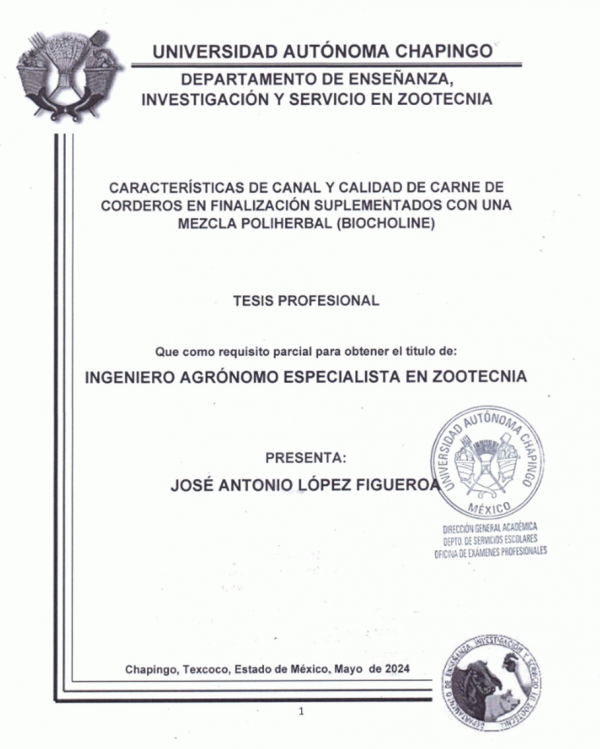 Características de canal y calidad de carne de cordero en finalización suplementados con una mezcla poliherbal (Biocholine) / por José Antonio López Figueroa; director de tesis José Felipe Orzuna Orzuna; secretario Alejandro Lara Bueno; vocal Rodolfo Ramírez Valverde; suplente María Inés Sierra Galicia; suplente Laura Haydée Vallejo Hernández.