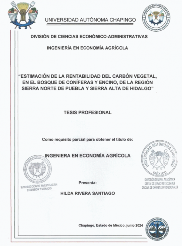 Estimación de la rentabilidad del carbón vegetal, en el bosque de coníferas y encino, en La Región Sierra Norte de Puebla y Sierra Alta de Hidalgo / por Hilda Rivera Santiago; director de tesis Gerónimo Barrios Puente; secretario José Luis Jolalpa Barrera; vocal Alejandro Alberto Miliano; suplente Ramón Gómez Castillo; suplente Evelina Álvarez González.