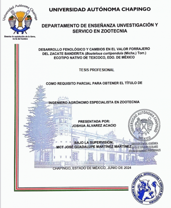 Desarrollo fenológico y cambio en el valor forrajero del zacate banderita (Bouteloua curtipendula (Michx.) Torr.) ecotipo nativo de Texcococ, Edo. de México / por Joshua Álvarez Acacio; director de tesis José Guadalupe Martínez Martínez; secretario Adrián Raymundo Quero Carrillo; vocal Laura Haydée Vallejo Hernández; suplente Jorge Luis Castrellón Montelongo; suplente Lillian Guadalupe López Chávez.