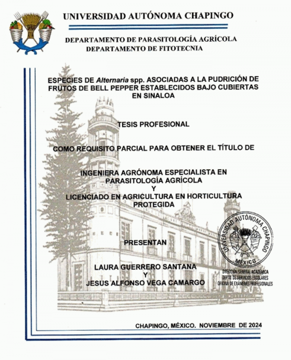 Especies de Alternaria spp. asociadas a la pudrición de frutos de bell pepper establecidos bajo cubierta en Sinaloa por Laura Guerrero Santana y Jesús Alfonso Vega Camargo; director de tesis Santos Gerardo Leyva Mir; secretario Elizabeth García León; vocal J. Jesús Magdaleno Villar; suplente Moises Camacho Tapia; suplente Calixto Leopoldo Carrillo Fonseca.