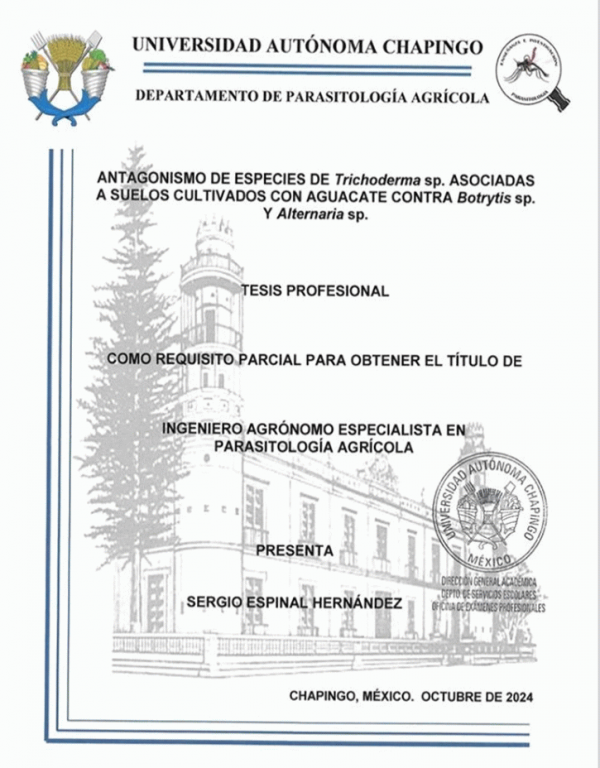 Antagonismo de especies de Trichoderma sp. asociadas a suelos cultivados con aguacate contra Botrytis sp. y Alternaria sp. / por Sergio Espinal Hernández; director de tesis Jaime Alfredo Urzúa Gutiérrez; secretario Manuel Alejandro Tejeda Reyes; vocal Evert Villanueva Sánchez; suplente Benito Reséndiz García; suplente Moises Camacho Tapia.