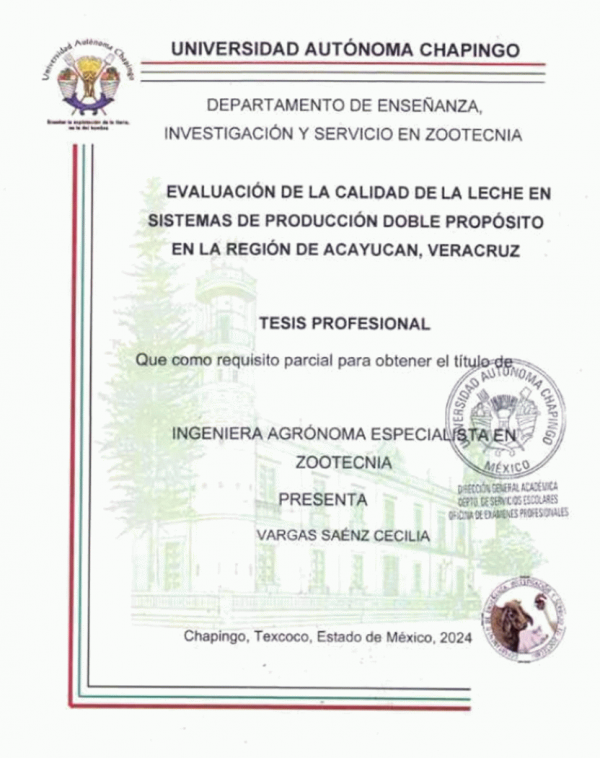 Evaluación de la calidad de leche en sistemas de producción doble propósito en la región de Acayucan, Veracruz / por Cecilia Vargas Sáenz; director de tesis José Guadalupe Martínez Martínez; secretario Guadalulpe Domínguez Peregrino; vocal Jorge Luis Castrellón Montelongo; suplente Joshua Alvarez Acacio; suplente María Lisbeth Vargas Saénz.