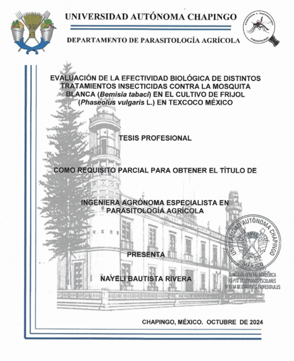 Evaluación de la efectividad biológica de distintos tratamientos insecticidas contra la mosquita blanca (Bemisia tabaci) en el cultivo del frijol (Phaseolus vulgaris L.) en Texcoco México/ por Nayeli Bautista Rivera; director de tesis Jaime Alfredo Urzua Gutierrez; secretario Candelario Santillan Ortega; vocal Calixto Leopoldo Carrillo Fonseca; suplente José Manuel Pineda Rios; suplente Racien Hernández Hernández.