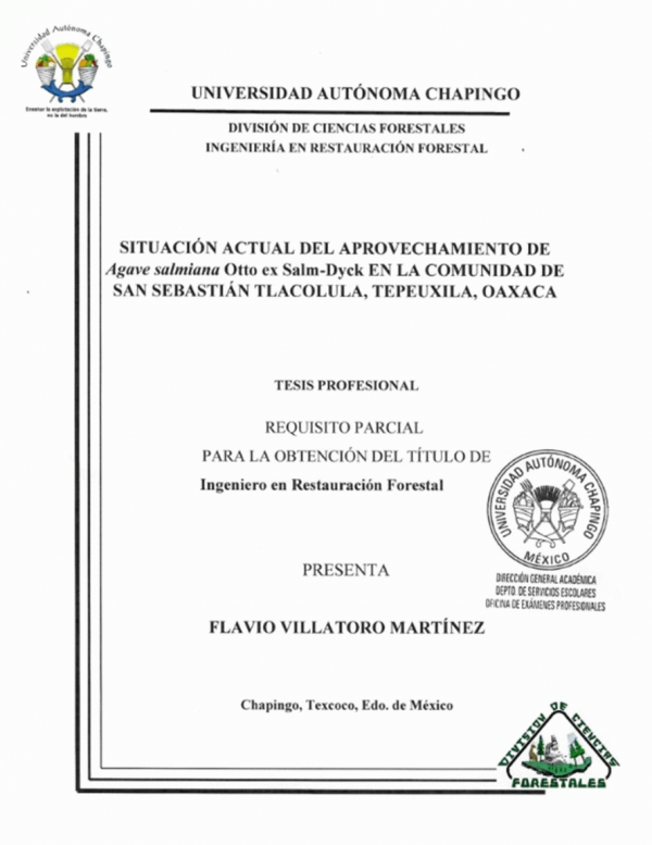 Situación actual del aprovechamiento del Agave salmiana Otto ex Salm-Dyck en la comunidad de San Sebastián Tlacolula, Tepeuxila, Oaxaca / por Flavio Villatoro Martínez; director de tesis María Guadalupe Vargas Cabrera; secretario Antonio Cortés Jiménez; vocal Ro Linx Granados Victorino; suplente Yolanda Franco Islas; suplente Saúl Castañeda Díaz.
