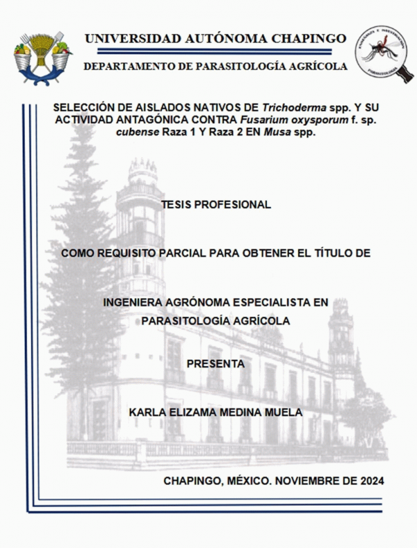 Selección de aislados nativos de Trichoderma spp. y su actividad antagónica contra Fusarium oxysporumf. sp. cubense Raza 1 y Raza 2 en Musa spp/ por Karla Elizama Medina Muela; director de tesis Oscar Morales Galván; secretario Alva Priscilia Suaste Dzul; vocal José Manuel Pineda Rios; suplente Calixto Leopoldo Carrillo Fonseca; suplente Antonio Tafoya Razo.