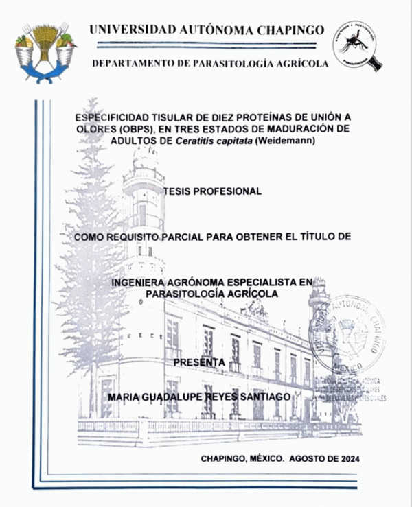 Especificidad tisular de diez proteínas de unión a olores (OBPS), en tres estados de maduración de adultos de Ceratitis capitata (Weidemann)/ por Maria Guadalupe Reyes Santiago; director de tesis José Manuel Pineda Rios; secretario Obdulia Lourdes Segura Leon; vocal Brenda Torres Huerta; suplente Oscar Morales Galván; suplente Candelario Santillan Ortega.