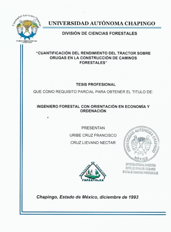 Cuantificación del rendimiento del tractor sobre orugas en la construcción de caminos forestales / por Francisco Uribe Cruz y Nectar Cruz Lievano; director de tesis Rigoberto Vargas Carballo; secretario Carlos Cíntora González; vocal Saúl B. Monreal Rangel; suplente Leonardo Sánchez Rojas; suplente Andrés de la Rosa Ramírez.